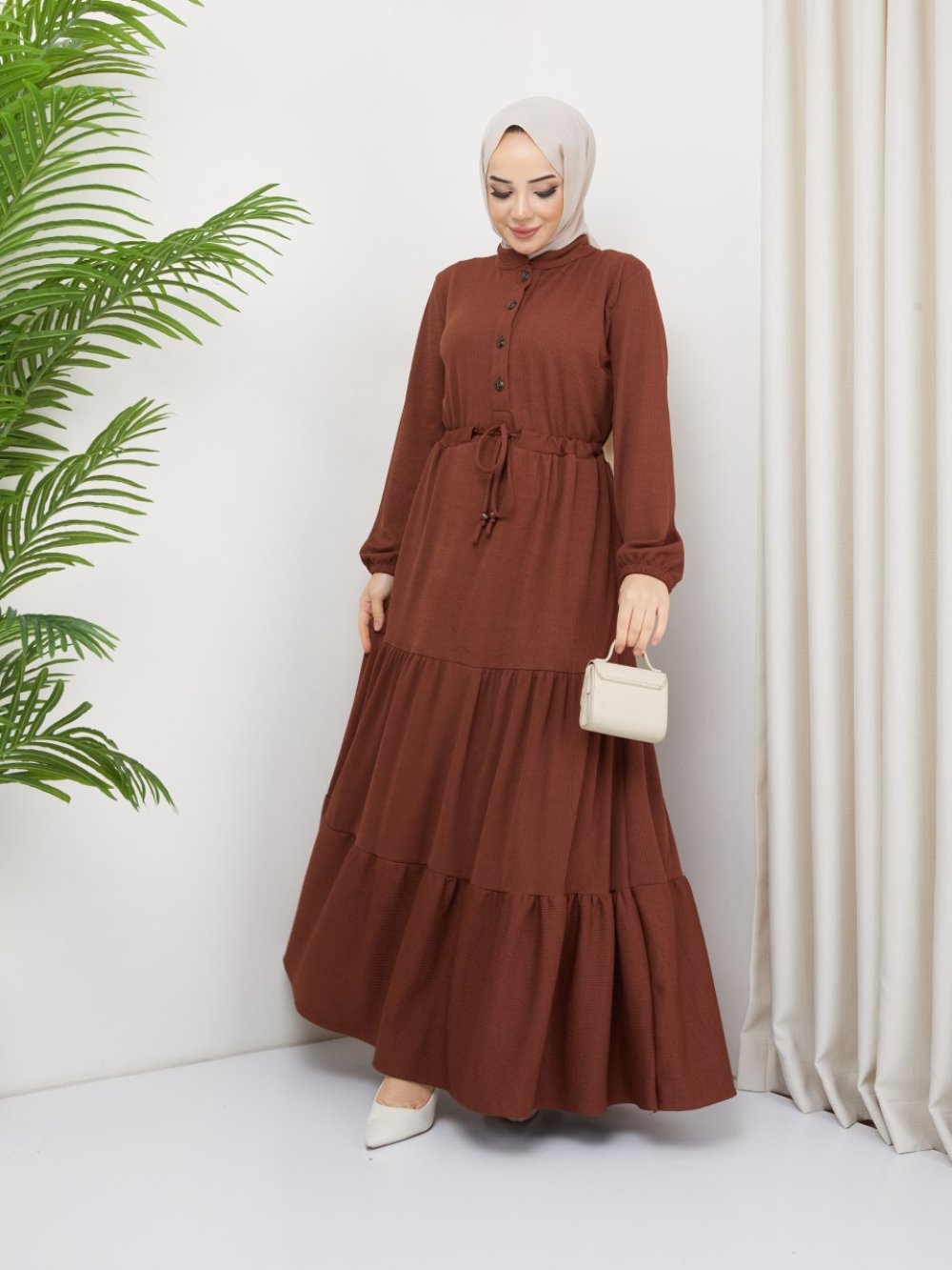 Düğmeli Sultan Elbise Kahverengi
