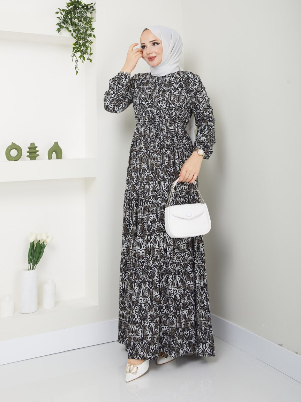 Ebru Viskon elbise Yarım düğmeli Gri Siyah